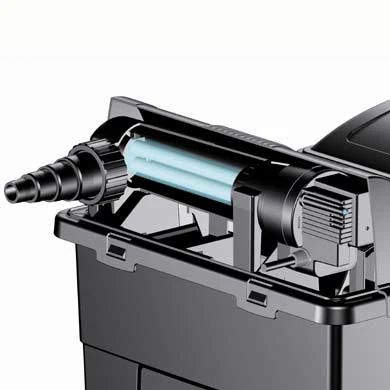 Der Durchlauffilter kann bis zu einem Drittel seiner Höhe eingegraben werden. Die Reinigung des verschmutzten Teichwassers erfolgt über spezielle Aktivfilterschäume. Die UVC-Technologie bekämpft Grünalgen und Krankheitskeime.