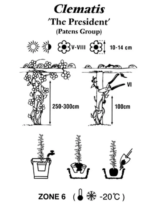 | Besonderheiten, Pflege: | Keine Staunässe, bei der Pflanzung den Ballen ein Handbreit unter die Erdoberfläche setzen. Rückschnitt: siehe Pflanzung und Pflege von Clematis |