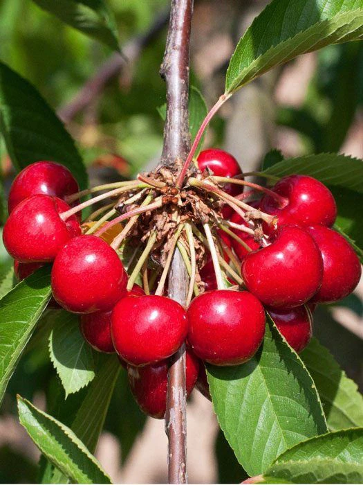 | Frucht: | Burlat: Groß bis sehr groß; leuchtendrot bis dunkelrot; Fleisch fest, saftig, süß mit gutem Aroma, Saft hellfarbig. Sunburst: sehr grosse, breitrunde Früchte mit purpurroter, leicht streifiger Schale. Fruchtfleisch mittelfest und saftig. |
