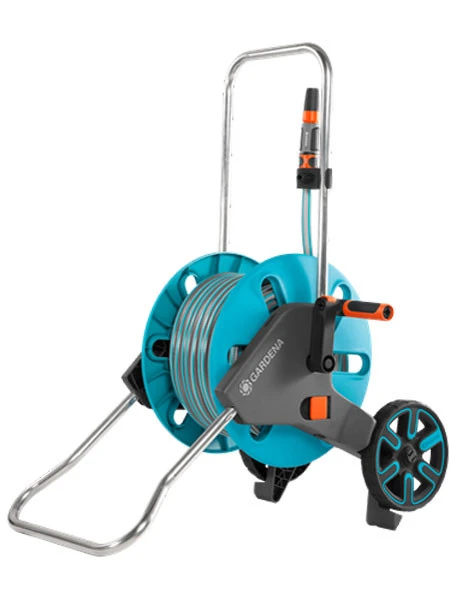Der GARDENA Schlauchwagen AquaRoll M ermöglicht eine platzsparende Aufbewahrung des Gartenschlauchs und ist komfortabel in der Handhabung. Durch die ergonomische Kurbel mit Weichkunststoffkomponente lässt sich der Schlauch zuverlässig aufrollen. Kein Umfallen mehr durch den ausklappbaren Standfuß. Seine spezielle Form sowie der sichtbare Räder-Hochstand unterstützen zudem die Standsicherheit des Schlauchwagens. Zur platzsparenden Aufbewahrung wird der Standfuß einfach eingeklappt, der Griff nach unten geschoben und die Kurbel schnell eingeklappt. Das AquaRoll M Set ist komplett mit 20 m Classic Schlauch 13 mm (1/2̎) mit Original GARDENA Systemteilen und Spritze sofort einsatzbereit.