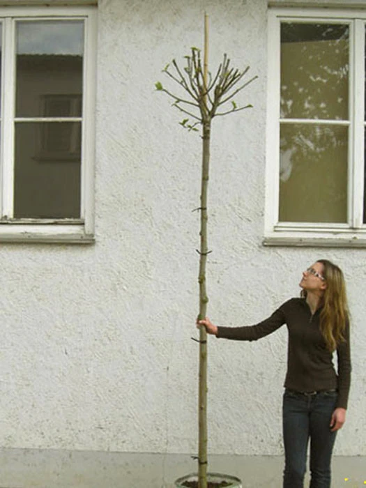Bild 5: durchschnittliche Lieferqualität nach fachgerechtem Rückschnitt für eine guten Kronenentwicklung nach der Verpflanzung. Der Umfang der Belaubung hängt vom Lieferzeitpunkt ab.