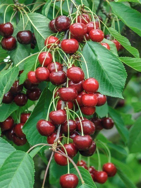 Frucht: Es handelt sich um eine Süßkirsche. Die mittelgroßen Früchte sind knackig und von einer rot-braunen Schale umgeben. Das tiefrote Fruchtfleisch ist sehr süß, saftig und hoch aromatisch. Die Früchte erreichen ein Gewicht von ca. 8 Gramm.