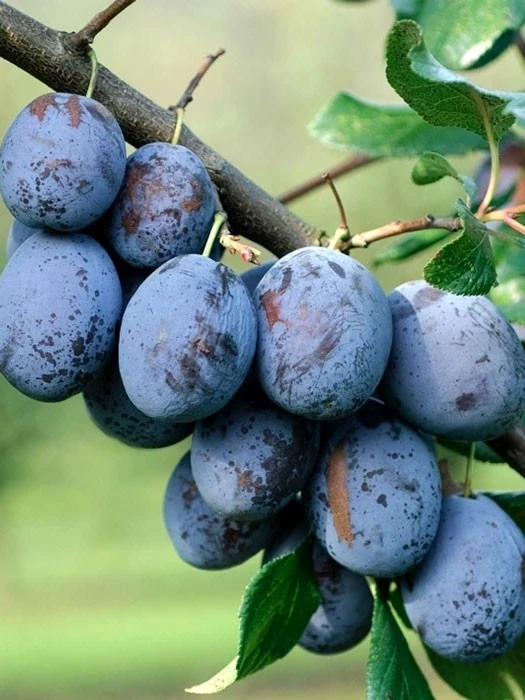 | Frucht: | Sehr groß, oval bis eiförmig; blaurot, schwach bereift mit zahlreichen Punkten; Fruchtfleisch dunkelgelb, süß. |